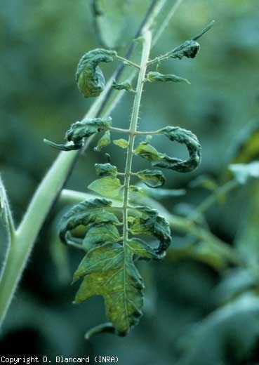 Several genetic mutations s or chromosomal aberrations (in the formation of chromosomes or their number) ( genetic abnormalities ) are responsible for changes in color and / or shape of the leaflets and in tomato leaves. With regard to leaf deformations, we can observe more or less "crumpled" leaflets, rolled up in relation to their axis or their plane; the tissues are thicker (figure 1). It should also be noted that the plants are often sterile (hence their name of “ sterile mutants ”) and that they quite frequently take on a bushy appearance. Several types of sterile plants can appear in culture. The most common type occurs as plants with reduced, distorted, and often coiled leaves, bearing much less long hairs on stems, leaves, and flower stalks than normal plants. Another type manifests as more vigorous plants, with darker foliage and larger leaflets; the stem and the tissues are often thicker (this type is called " bull plants " by the Anglo-Saxons).