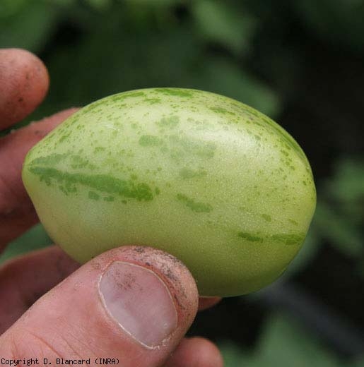 - sometimes deformed fruits with silvery green streaks turning pale yellow at maturity in the event of partial manifestation (figure 5).