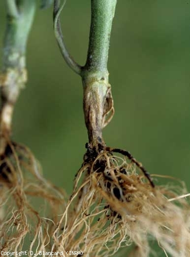 Present in many soils and in certain substrates, responsible for damping off seedlings and root alterations (see the chapter on Root browning ), Rhizoctonia solani is mainly present in nurseries, extensive nurseries being the most affected. It is able to attack the root collar of the tomato ( Rhizoctonia basal stem canker) . On the latter, it causes lesions appearing either after planting or later on plants produced under unfavorable conditions. At first moist, brownish, sometimes reddish brown, their outline is well defined. Ultimately, these cankers may surround the base of the stem and often take on a rather dry appearance (Figures 1 and 2). Often, this damage also extends to the upper part of the root system.