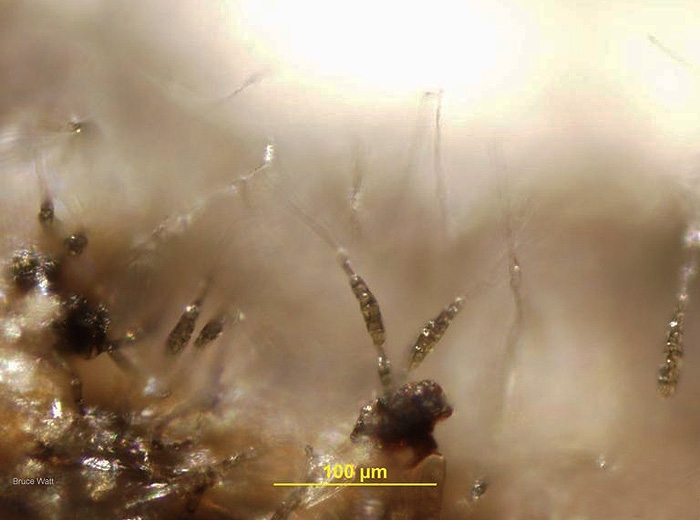 On colonized tissues, if the climatic conditions are humid , A. tomatophila does not take long to produce short conidiophores (figure 1) surmounted by long conidia multicellular club-shaped (figure 2). These are disseminated by the wind , but also by rain and as a result of sprinkling. The presence of water is necessary for sporulation to take place. Seeds, workers, especially through their tools, also contribute to the spread of early blight. The conidia produced ensure secondary contaminations and subsequently several parasitic cycles may take place in the culture.