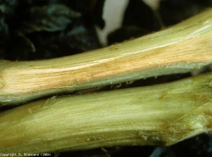 The symptoms of verticillium wilt tend to be expressed in spring and autumn in France; the spread of the disease can stop during the summer period. Unlike fusarium, they do not lead to the death of plants but contribute to their weakening and reduced yields.