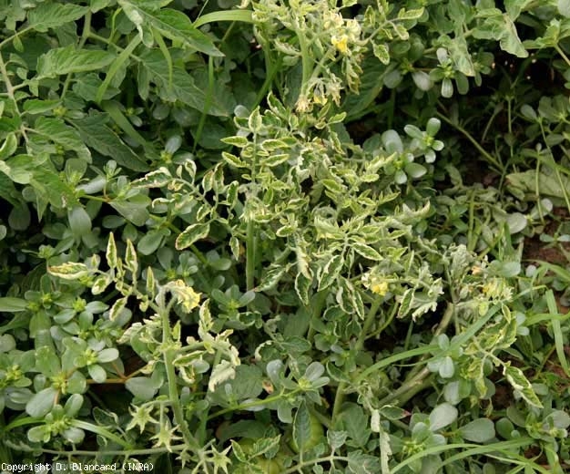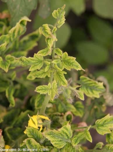 Generally, plants affected by the tomato ( yellow leaf curl virus Tomato yellow leaf curl virus , TYLCV), a Begomovirus strictly dependent on phloem, see their growth slowed down or even blocked (Figures 1 to 4). They take on a puny and bushy appearance, because of the development of numerous axillaries, and the reduction in the length of the internodes. In the case of early infections, they remain dwarf and do not produce fruit.