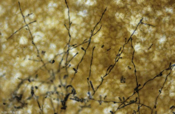 Within 4-6 days of infection, short conidiophores (Figure 1) arise on secondary hyphae formed on the surface of the leaf blade and produce conidia (Figures 2 and 3). Sporulation is very abundant. Conidia are quite fragile and only live for a few hours, or even a few days, when conditions are favorable. They are very light and are therefore easily transported and dispersed by the wind (up to 200 km according to some authors) and, incidentally, by rain or sprinkler irrigation, during splashing. Disseminations are greatest at night, between midnight and 4 a.m.