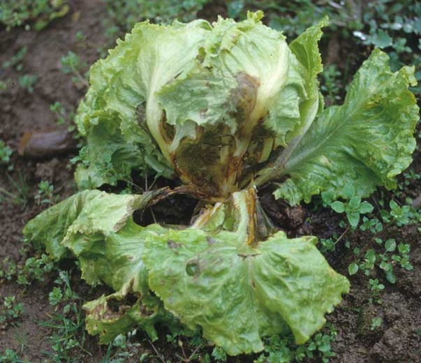Sur laitue, on constate d'abord des lésions assez localisées, plus ou moins nombreuses, sur le limbe et la nervure principale des feuilles basses au contact du sol (figures 1 et 2). Elles sont initialement de consistance sèche et ont une teinte rouille à brun foncé. Elles évoluent plus ou moins rapidement en fonction des conditions climatiques. Leur extension conduit parfois à la formation de taches chancreuses concaves sur la nervure principale (figure 3). Une pourriture assez humide ne tarde pas à s'installer sur les nervures principales de plusieurs feuilles ainsi que sur le limbe à proximité. Elle gagne progressivement le pivot via la zone d'insertion des feuilles. A terme, les premières feuilles touchées, les plus externes, flétrissent. Leur limbe ne tarde pas à se dégrader sous l'action conjuguée de Thanatephorus cucumeris mais également de bactéries secondaires qui amplifient la pourriture initiée (figure 4). Botrytis cinerea peut lui aussi coloniser secondairement les tissus altérés.