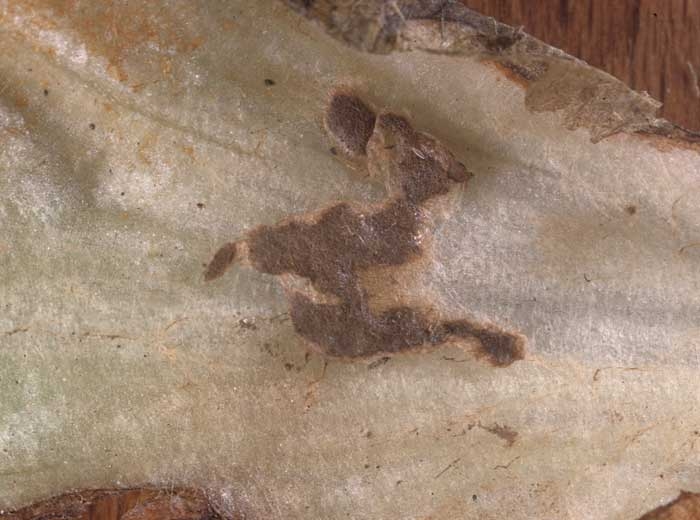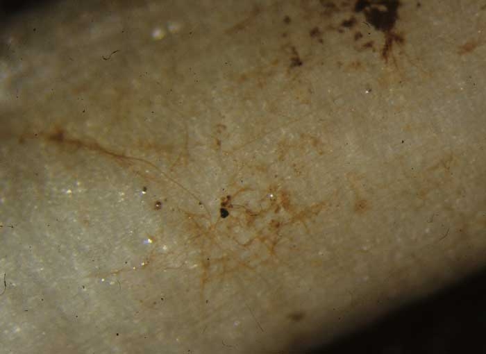 La présence de Thanatephorus cucumeris sur les tissus altérés peut être confirmée par l'observation visuelle, ou à l'aide d'une loupe binoculaire et/ou d'un microscope, de ses rares sclérotes (figure 7) ou de son mycélium brun caractéristique (figures 8 et 9). Notons que son mycélium n'est pas observé facilement, du fait de sa dégradation rapide sur les tissus altérés.