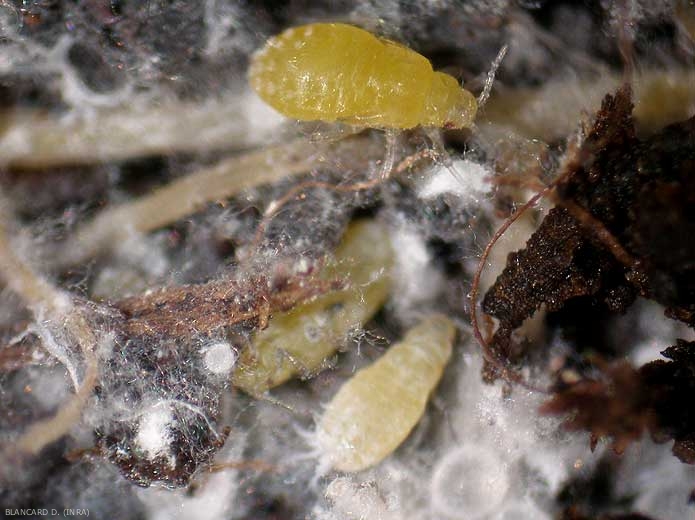 Les attaques de ce puceron sont surtout observées en plein champ à proximité de haies de peupliers. En effet, cette espèce hiverne sur cet arbre à l'état d'oeufs, puis sous la forme de femelles aptères au printemps, s'alimentant sur les pétioles et entraînant la formation de galles. On la retrouve plus rarement sous abris.