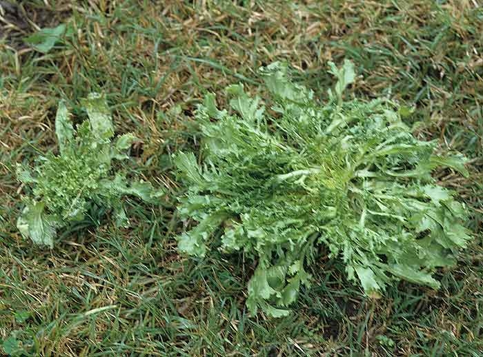 Dans certaines situations, les salades peuvent présenter, dans un premier temps, une pousse tout à fait normale. Puis, soudainement en cours de croissance, le bourgeon peut rester bloqué ou se développer modérément. Dans ce cas, la taille des vieilles feuilles contraste avec celle des plus récentes. Des attaques d'un virus en cours de culture, l'apport accidentel d'un herbicide (figure 5)... peuvent être à l'origine de tels dégâts (pour plus d'informations, consulter la fiche Phytotoxicités diverses).