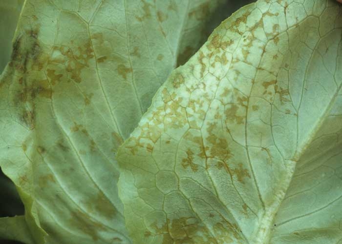 L'agent des anneaux nécrotiques de la laitue (Lettuce ring necrosis agent, LRNA) est responsable de la maladie des taches orangées. Il provoque des taches et des anneaux chlorotiques à la face supérieure du limbe des feuilles basses des laitues (figure 1). Sous les feuilles, ces altérations sont graisseuses et de couleur plus ou moins orangée ; ce symptôme est à l'origine du nom français de la maladie (figure 2). Si les conditions sont favorables, sur laitue beurre, une forte proportion du limbe prend une couleur jaune assez marquée (figure 3) ; les tissus atteints ne tardent pas à se nécroser et à se dessécher (figure 4).Le LRNA est transmis par un champignon du sol : Olpidium virulentus (ex Olpidium brassicae). Il n'affecte que les laitues cultivées en hiver sous abris. Les sols lourds, mal drainés et froids, favorisent le développement du champignon vecteur et l'expression des symptômes de cette virose. Il n'est pas rare d'observer cette dernière dans des parcelles atteintes par la maladie des grosses nervures (MLBVV). Leurs symptômes respectifs étant très différents, les confusions de diagnostic ne sont pas possibles (voir aussi les liens Virus des grosses nervures de la laitue (MLBVV) et Agent des anneaux nécrotiques de la laitue (LRNA)). Il n'en est pas de même avec la mosaïque jaune du pissenlit (DaYMV). Cette virose transmise par les pucerons provoque, en conditions hivernales, un rabougrissement des plantes, accompagné de jaunissements foliaires (figure 5). L'incidence de cette virose à cette période de l'année est assez mal connue, ce virus n'ayant été détecté en France qu'assez récemment (voir le lien Virus de la mosaïque jaune du pissenlit).
