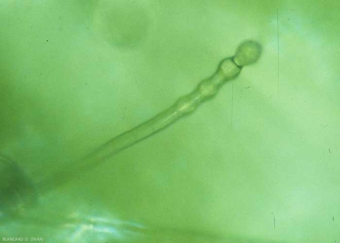 La détermination de l'oïdium des salades, induit par l'attaque de Golovinomyces cichoracearum var. cichoracearum (Erysiphe cichoracearum), ne pose généralement pas de problème. En effet, le feutrage blanc et poudreux couvrant surtout la face supérieure des feuilles (figure 1 à 3) est un symptôme suffisamment caractéristique pour qu'il ne puisse pas y avoir de confusion de diagnostic. Ce feutrage blanc est en fait constitué d'un réseau mycélien colonisant superficiellement le limbe, surmonté de nombreux et courts conidiophores portant plusieurs conidies hyalines en chaîne (figure 4). La présence de Golovinomyces cichoracearum var. cichoracearum sur les feuilles entraîne à terme la chlorose et le brunissement du limbe. De minuscules cléistothèces globuleux (organes assurant sa reproduction sexuée), localisés à proximité des nervures, sont signalés dans la littérature. Malgré la spécificité de ces symptômes, quelques confusions sont parfois faites, notamment lorsque des feuilles sont tachées de blanc à la suite d'irrigations par aspersion avec une eau très calcaire ou de traitements phytosanitaires laissant un dépôt.