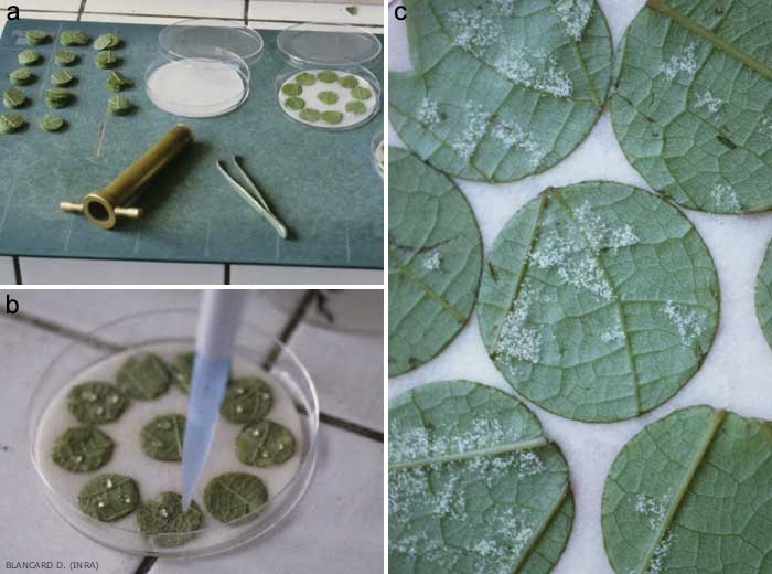 Plasmopara viticola is not a fungus, but a stramenopile (chromist), a microorganism classified with brown algae. It is an obligate parasite which one is currently unable to cultivate on synthetic culture medium. To conserve, multiply and study it, we have to keep it on the leaves or leaf discs of surviving vines (figure 1).
