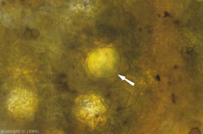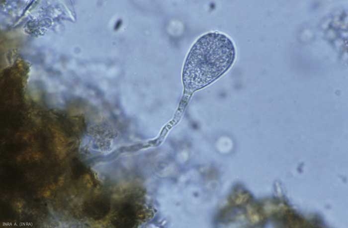• The oospores (figures 2 to 4) materialize its sexual form (teleomorph) and ensure its winter conservation in the leaf tissues. Yellow in color, they measure between 25 and 40 µm in diameter. They germinate in the spring and give rise to a macroconidia (figure 3) forming at the end of a mycelial filament. Rather pear-shaped, this macroconidia measures 23-27 x 30-41 µm and produces several dozen zoospores piriform to ovoid (figure 4), measuring 4-5 x 6-10 µm, and mobile thanks to two flagella.