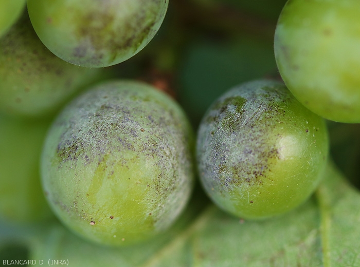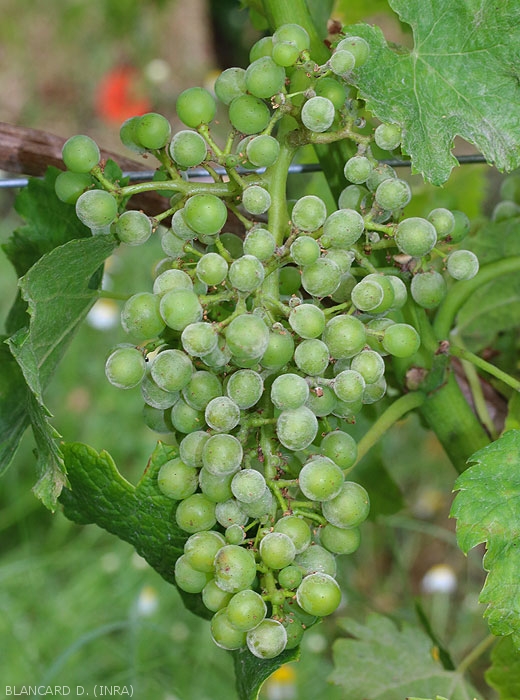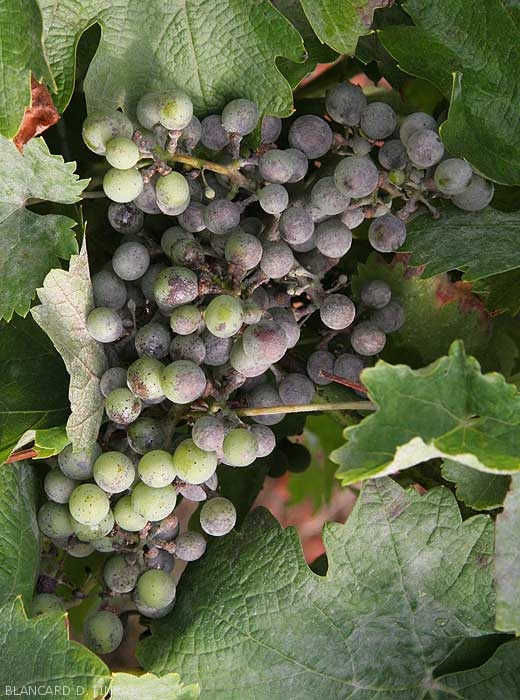 The severity of powdery mildew attacks on berries is very dependent on the intensity and precocity of the infections occurring after flowering. It should be added that the development of E. necator is gradually reduced as the sugar and anthocyanin content of the berries increases.