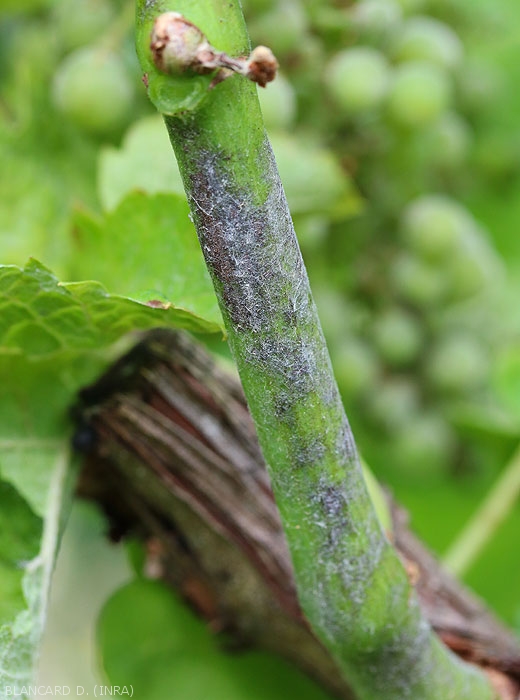 Young twigs are also colonized by E. necator . Covered by its mycelium, they present spots, even irregular and ill-defined areas more or less powdery. The hardening of oidized twigs is often partial and in the fall, the areas affected by E. necator take on a brownish to blackish tint that is always visible during the winter (Figures 7 and 8).