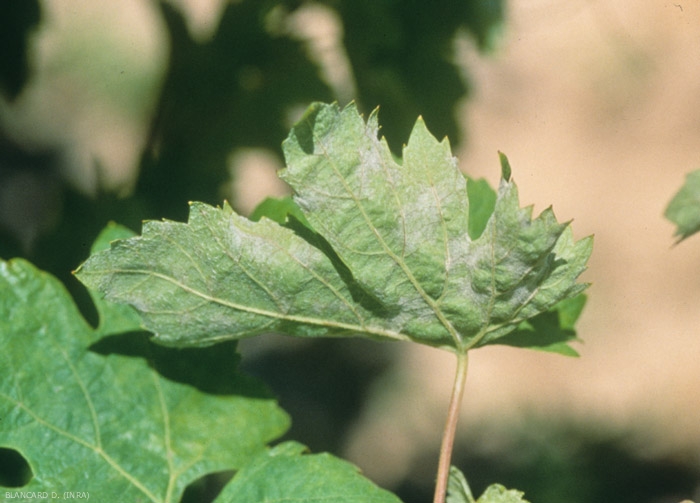 Whatever the powdery mildew facies, the affected leaves are often more or less deformed and sometimes chlorotic; in severe attack, they can dry out and drop.