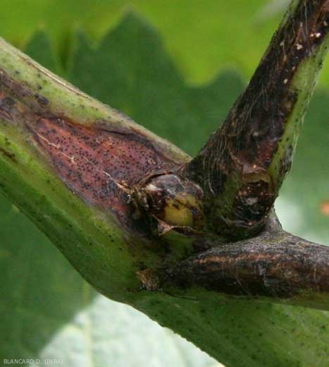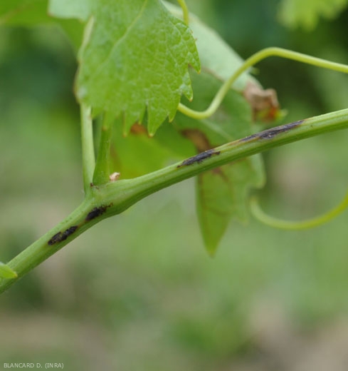 Elongated, depressed spots are also visible on the petioles, raceme peduncles and tendrils (Figure 6); they are chlorotic with a black center. During their extension, the infected tissues turn black-brown and become covered with pycnidia. The young twigs, (Figures 7 and 8) less frequently affected, show comparable canker lesions varying in length from a few millimeters to more than 2 cm. Pycnidia easily form on these lesions (Figure 9).