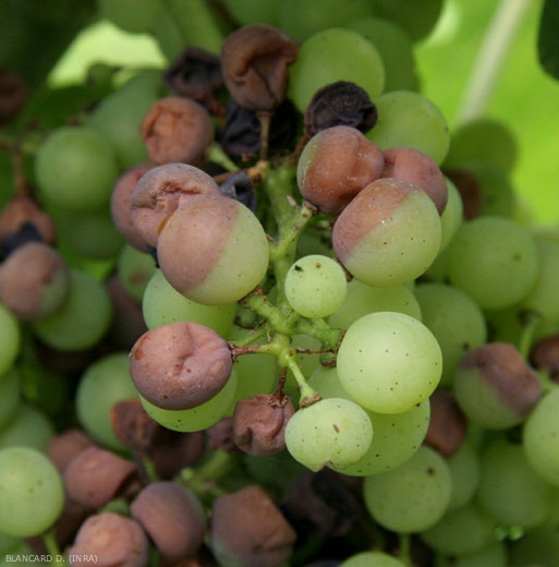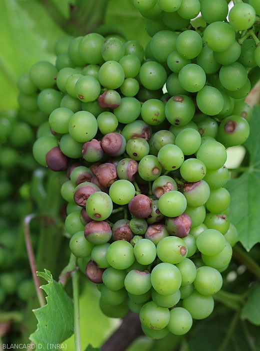 Guignardia bidwellii , like Phomopsis viticola , mainly attacks all young organs of the vine in the active growth phase, and in particular the leaves and clusters.
