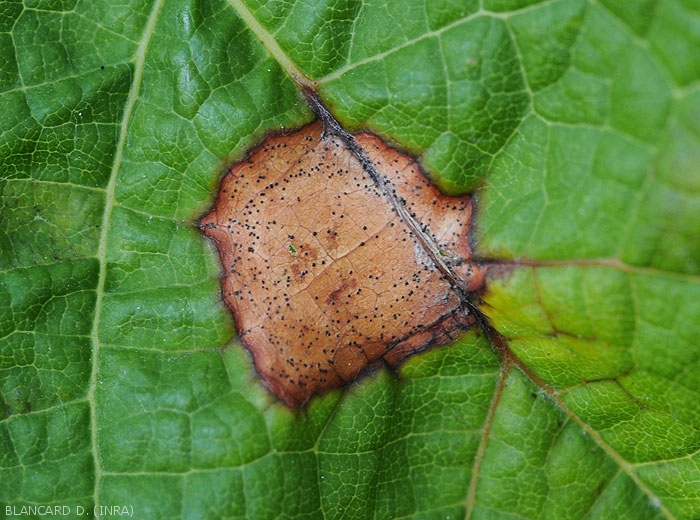 Symptoms first appear on the lower leaves of the vine, as their environment is more humid. Small spots, which can reach 10 mm in diameter at the end of the course, appear on them, generally two weeks after infection; they are slightly chlorotic at first, and circular to more or less polygonal (figure 1). They gradually spread and take on a first gray color then light brown, while their periphery is bordered by a dark brown border (Figures 2 and 3). When conditions are favorable, tiny black spherical structures visible to the naked eye quickly form on the upper surface of the leaves (Figures 4 and 5): these are the imperfect shape pycnidia of the fungus. These are arranged concentrically around the periphery of the spots, or sometimes linearly along the veins. The number of spots present on the leaves can vary from a few lesions to almost complete coverage of the affected leaf blades.