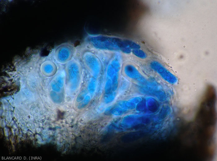 - The imperfect shape produces pycnidia spherical (59-196 µm in diameter), solitary, protruding, black, opened by an ostiole (figures 5 to 9) from which the will escape when ripe pycniospores (figures 10 and 11). These pycniospores are colorless, ovoid (4.5-9.3 x 4.5-5 µm) embedded in a mucilaginous cord (cirrh) of whitish color (figure 7).