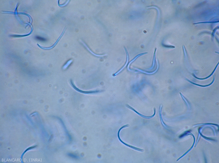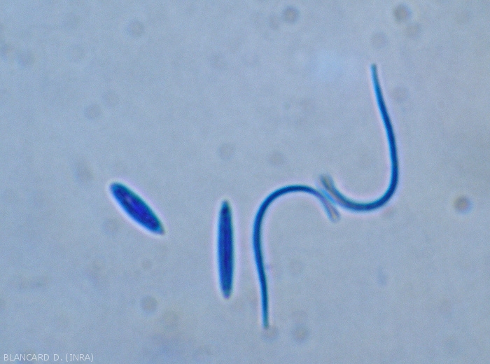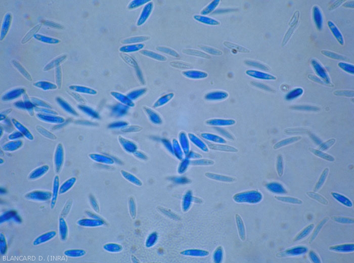 • Des spores α (alpha) (figures 7, 8, and 10), conidies monocellulaires incolores, ELLIPTIQUES to fusoïdes, mesurant 7-10 x 2-4 pm; At the poles of these spores are noted two characteristic spherical formations, comparable to drops of oil;