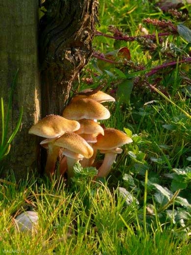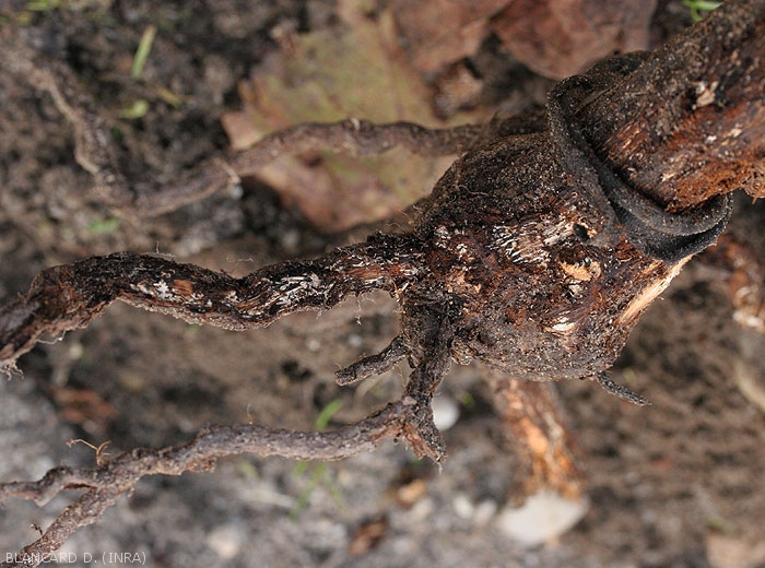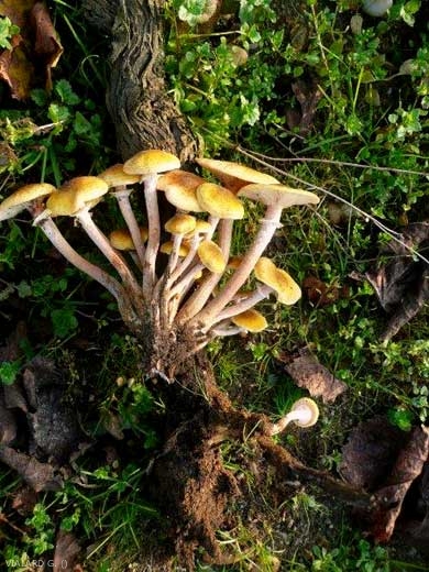 Sometimes, we note on the roots the presence of rhizomorphs, kinds of dark brown to black cylinders, smooth and shiny, 1 to 1.5 mm in diameter and ten or more centimeters long. of the armillaria, tufts of carpophores honey-yellow are visible at the feet of vines that die in autumn (figures 5 and 6). - Rosellinia necatrix causes different symptoms from the previous ones. Outside the root, when the climatic conditions are favorable (high relative humidity), we observe white mycelial webs becoming smoky gray, very abundant but very fragile, having the appearance of a spider's web (facies to the origin of the name of this disease). More generally, we note the presence of white cords of loose structure that can also be found in the interstices of the ground.