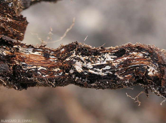 - Amillaria mellea affects roots whose bark turns brown and peels off easily, in the absence of visible external mycelium. On the other hand, one can observe, between the bark and the wood, a network of ribboned cords and white palmettes (figures 1 and 2). This network can come together to form an almost continuous mycelial sleeve which can go up to the neck of the plant.