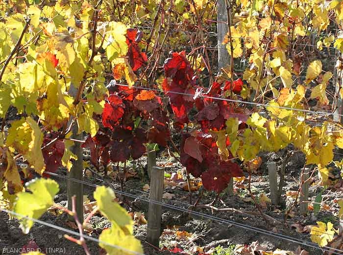 - a slow form characterized by a progressive dieback of the plant which dwarfs and presents buds which abort. The internodes are shorter, the leaves smaller but generally not deformed. Sometimes, in mid-summer and depending on climatic conditions, the leaves of white grape varieties turn yellow and those of black grape varieties redden, this before premature defoliation (figures 7 to 10);