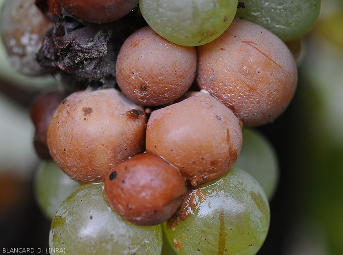 The rot acid starts frequently near the stem attaches bays or at various injuries. The altered tissues then take on a color which varies according to the state of development of the rot and the grape varieties. It is rather light brown on white varieties (figures 1 to 7) and purple to reddish on red varieties (figures 8 to 10). Once initiated, the rot spreads fairly quickly to the entire berry which, as a rule, retains its shape. Its skin gradually weakens and juice flows, giving a shiny appearance to the adjoining berries located below. More rarely, whitish mucous masses are observed following the formation of yeast colonies (figure 5). These clusters should not be confused with the many eggs that fruit flies lay on the wounds of rotten berries. Some clusters may be entirely affected (Figure 11).