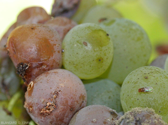 A vinegar odor characterizes the disease; sometimes very strong, it emanates from particularly affected bunches and vines. The presence of numerous fruit flies (figures 12 and 13) is also a distinguishing factor of this decay.