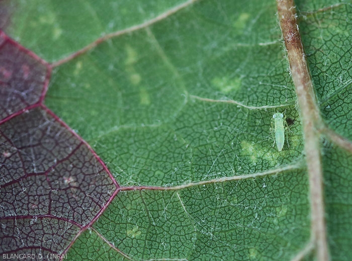 • Empoasca vitis in the stage adult is light green in color and elongated in shape. It is 3-4mm long, and it has wings longer than the body, translucent with green veins. It moves and flies quickly.