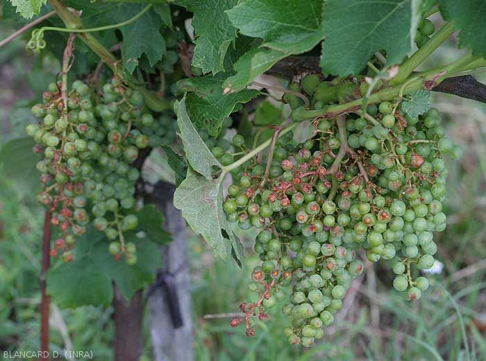 Sunburns are quite common in plants, as in vines. They appear on the herbaceous parts at temperatures above 42 ° C, and in particular the usually shaded organs. We can thus observe partial desiccations of the leaves , the blade of which turns brown and necroses over more or less extensive areas. On berries , it is essentially the side most exposed to the sun that is affected. Thus, a reddish brown lesion appears on one side of the fruit, subsequently the entire berry can dry out. If the stress is high, the cluster whole is affected.