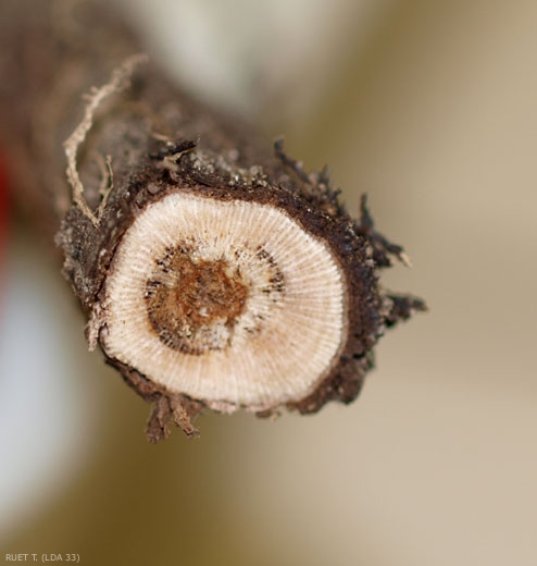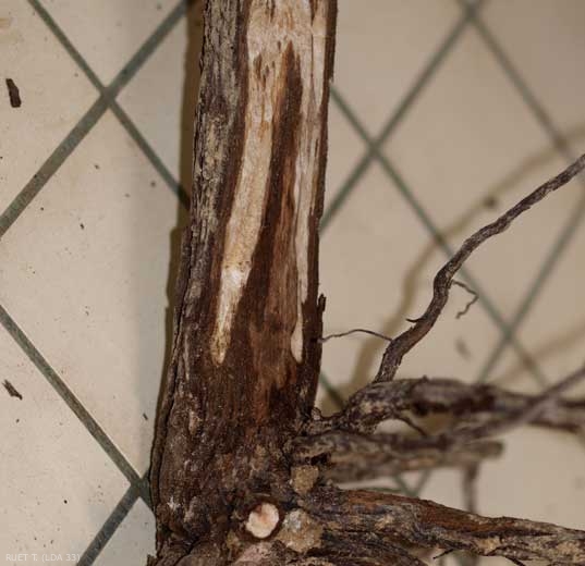 - Cross sections made in the necrotic part of the rootstock show one or more brownish necrotic lesions in the wood evolving from the bark to the pith (Figures 5 to 8). Longitudinal sections allow us to observe that they have a variable length and that they follow the vessels of the wood. Tylosis phenomena can accompany these symptoms.