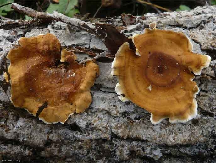 Stereum hirsutum produces carpophores (Figure 11) initially as circular crusts, partially peeling off and undulating, 2-10 cm long and 1-3 cm wide. Their color evolves: first sulfur yellow, with orange concentric zones, they take on a grayish tint, felted with white hair, with a lobed and wavy margin of bright yellow color in young subjects. They are 1 to 2 mm thick; they are therefore quite thin but hard, and tenacious. The hymenium is smooth, ocher-yellow to slightly orangey yellow. This fungus can be cultivated on an artificial medium (figures 12 and 13).