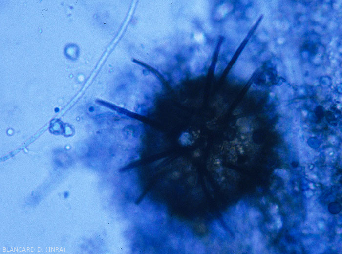 Development, sporulation : rapidly colonizes the tissues of the cortex thanks to its mycelium, gradually leading to its rotting or suberization. It exceptionally forms irregularly sized pycnidia, producing ellipsoid conidia of 4-6 x 1-1.5 µm (Figure 1) and bearing setae on weathered tomato roots.