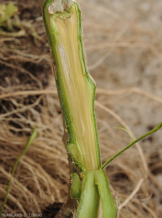 • Infection : Direct penetration of the mycelium into the roots, either through various injuries, and / or attacks by root-knot nematodes and Pratylenchus spp. Invasion of the vascular system of plants that they gradually colonize. These react by forming gum or tyloses which prevent their progression. These defense mechanisms, associated with colonization and clogging of vessels by the mycelium, contribute to the wilting of plants.