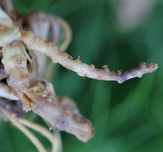 In fact, the leaf wilting observed is the result of primary symptoms located on the roots (figure 3). On the latter, we can observe generally brown lesions, of limited size at first (Figure 4). Subsequently, root degradation is accentuated and generalized. Thus, most of the damaged secondary and tertiary roots break off and decompose. They are therefore generally not visible when diseased plants are pulled up. It should be noted that secondary microorganisms can invade root tissues, in particular those of the cortex, and thus contribute to their destruction (figure 5).