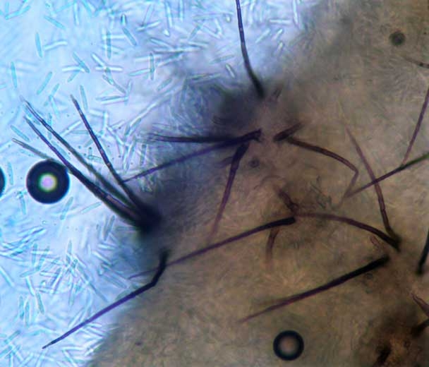 As previously stated, C. orbiculare produces in about five days, weather permitting, acervuli (Figures 2 and 3) on leaf lesions or on those localized on stems and fruits. These structures, materializing its asexual reproduction, generate abundant conidia (13-19 x 4-6 µm) (figure 4) grouped together in the form of a mucus which are disseminated in different ways: