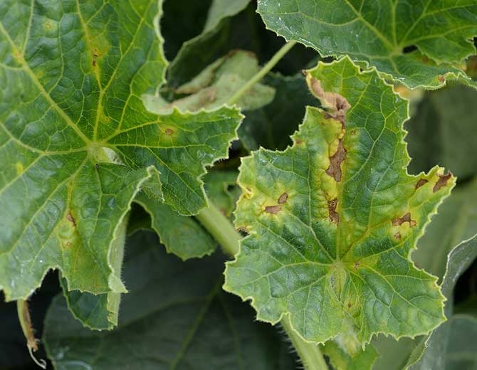 Small moist lesions appear on leaves often the youngest . These lesions gradually spread to form more or less circular spots, turning brown and necrotizing with age. They can sometimes take a grayish tint and be haloed with a more or less wide yellow halo. Affected tissue may loosen and fall, giving the inner part of the spots a more or less starry appearance, and the leaves a riddled appearance. Note that wet lesions sometimes start from veins that turn brown locally. On melon leaves (Figures 2 to 7), brown, small and necrotic spots appear. They can also be greyish, brown on the periphery, sometimes angular, surrounded by a yellow halo. Brown necrosis of the nerves also forms.