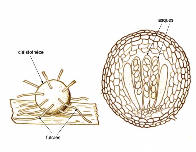If conditions are suitable for sexual reproduction, which seems a rare event, cleistothecia develop within the mycelium over several weeks. At maturity and in the presence of water, ascospores are ejected and disseminated by air currents.