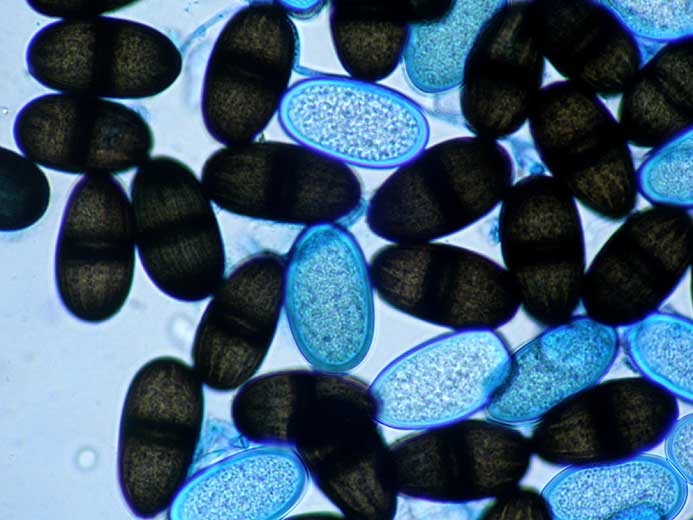 It produces black pycnidia on colonized tissues, rather round and containing one or more cavities. Conidia are formed inside; they are initially hyaline, unicellular, ovoid to ellipsoid, and have a thin wall. As they age, they take on a dark brown hue, become compartmentalized and become bicellular, and exhibit longitudinal streaks.