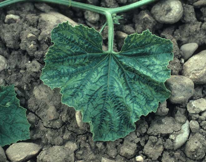 In watermelon : Most strains of SqMV do not infect watermelon. However, one strain has been reported in Arizona to cause severe mosaicism in this species.