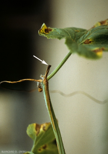 Necrosis is observed on the petioles and stems (Figure 7) and necrotic spots can sometimes appear on the fruits.