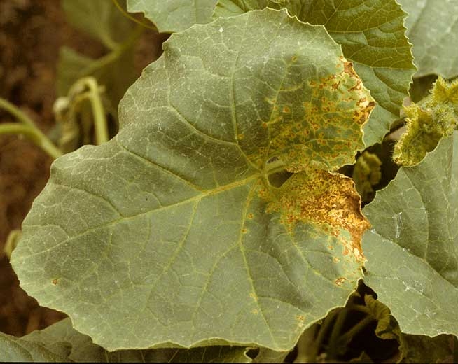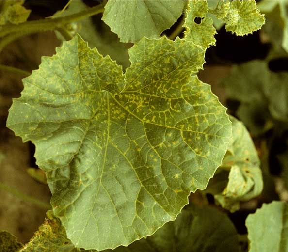 In cucumber: symptoms are expressed by necrotic spots 5 to 10 millimeters in diameter on the leaves. These spots can then merge and cause necrosis of the leaf or even of an entire branch. In co-infections with CGMMV, oily chlorotic spots may be observed on the fruits.