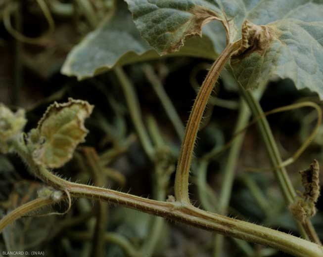 In addition, certain strains of ZYMV are responsible in a large number of commercial varieties of melon (possessing a particular gene, the gene Fn ) for very rapid wilting of the infected plant (Figures 6 and 7). The latter then dries up completely in a few days. This symptom may sound like an attack by Fusarium or another vascular pathogen, but in this case the vessels of the neck or stem remain intact.