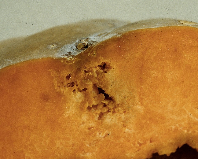 Amber-colored exudates sometimes form at the lesions and they can develop in depth and reach internal tissues which darken; the seeds thus become contaminated (figure 9). Some early and severely affected fruits show cracks, canker lesions (figure 10); they are sometimes strongly deformed. They can decompose under the complementary action of secondary invaders.