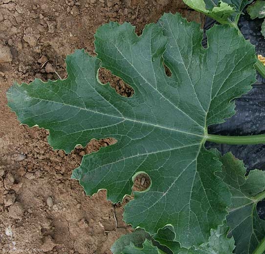On some varieties of zucchini and squash, we can very often see the presence of angular silver spots on the leaves (figure 1). They are caused by a local detachment of the epidermis without consequences for the plants; the presence of a layer of air between the epidermis and the parenchyma is at the origin of this silvery aspect of the macules.