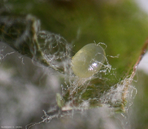 Magnification of the cigar formed by the rolling of the leaf blade of a vine leaf by the female <i> <b> Byctiscus betulae </b> </i>.