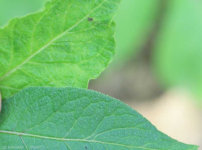 - mosaic pattern or mottling : alternating patches of light green and dark green areas without any leaf distortion, more or less visible depending on the potato cultivar and the climate (usually more visible in overcast weather) (photos 9 to 11).