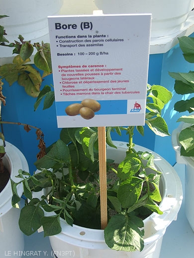 - Symptoms of deficiency: a typical symptom consists of the death or delayed development of the growing buds on foliage or tubers. The terminal bunches of the plants turn yellow and necrotise (photo 1). The plants have a bushy appearance and the top leaflets are thickened and may curl upwards (photos 2 and 3). The plants may have a slow emergence and foliar development or may even be stunted, because of the shortening of the internodes. In severe cases, yield reduction may occur.