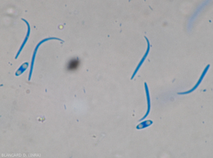 • Signs : presence of tiny black globular structures on damaged tissues: pycnidia (figures 14-leaf, 15 and 16-stem, 13 and 17-fruits) (figures 19 and 20) of the fungus containing ovoid to subcylindrical hyaline pycniospores (alpha spores) (Figures 21 and 23) or filiform and septate (Beta spores) (Figures 22 and 23).