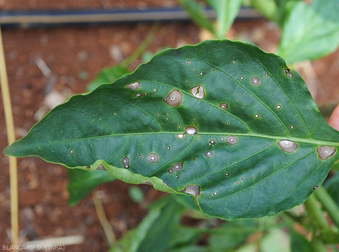 The center of the spots lightens gradually taking on a gray to whitish tint, and sometimes presents concentric patterns giving them a so-called "frog eye" appearance. A yellow halo is sometimes visible (Figure 3).